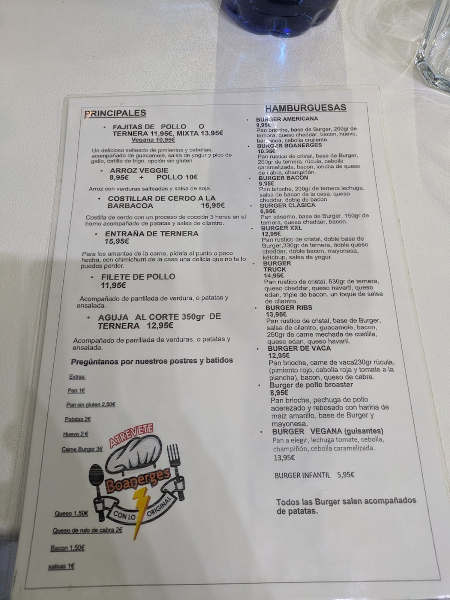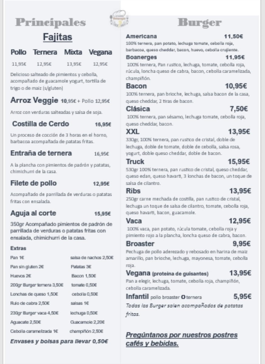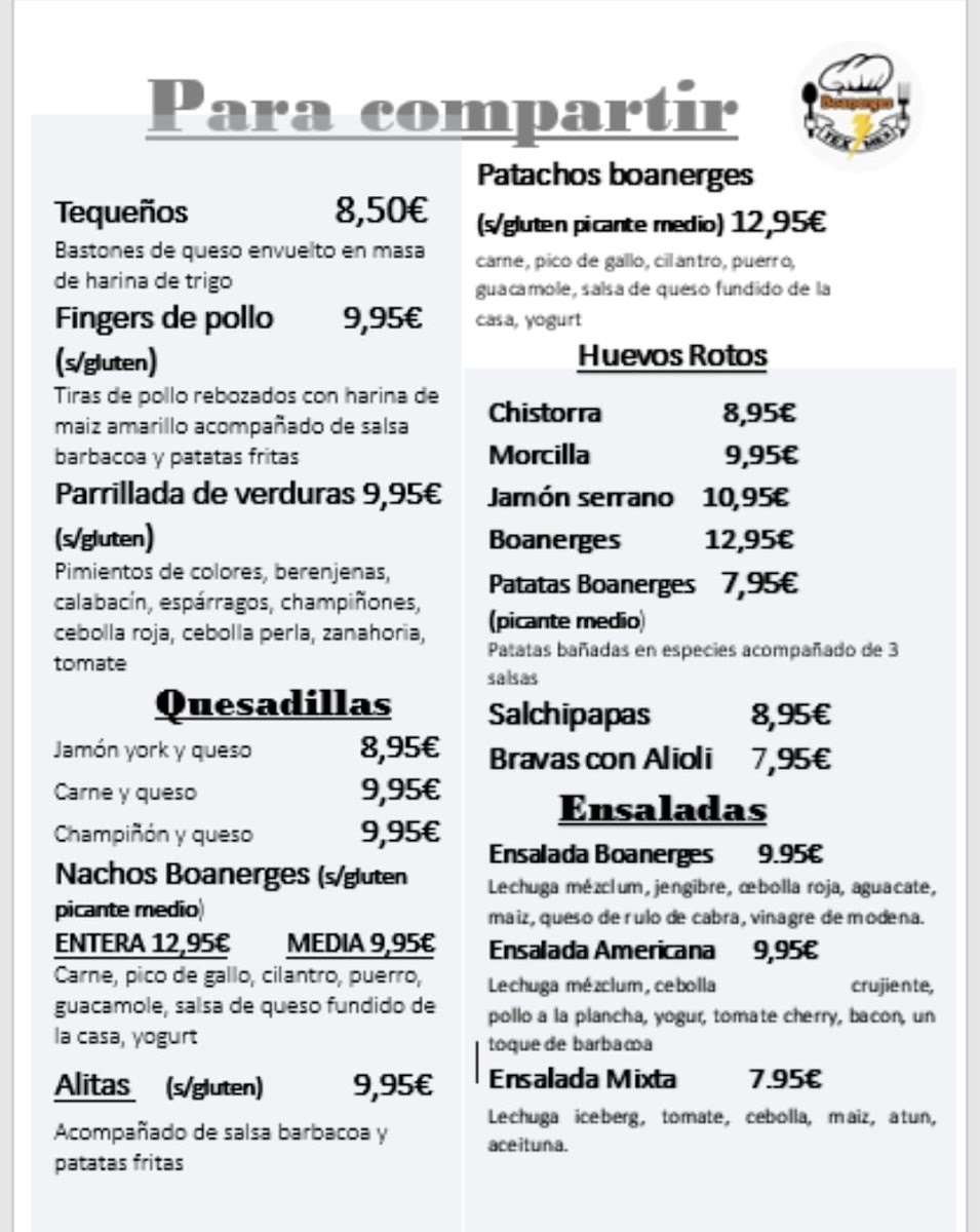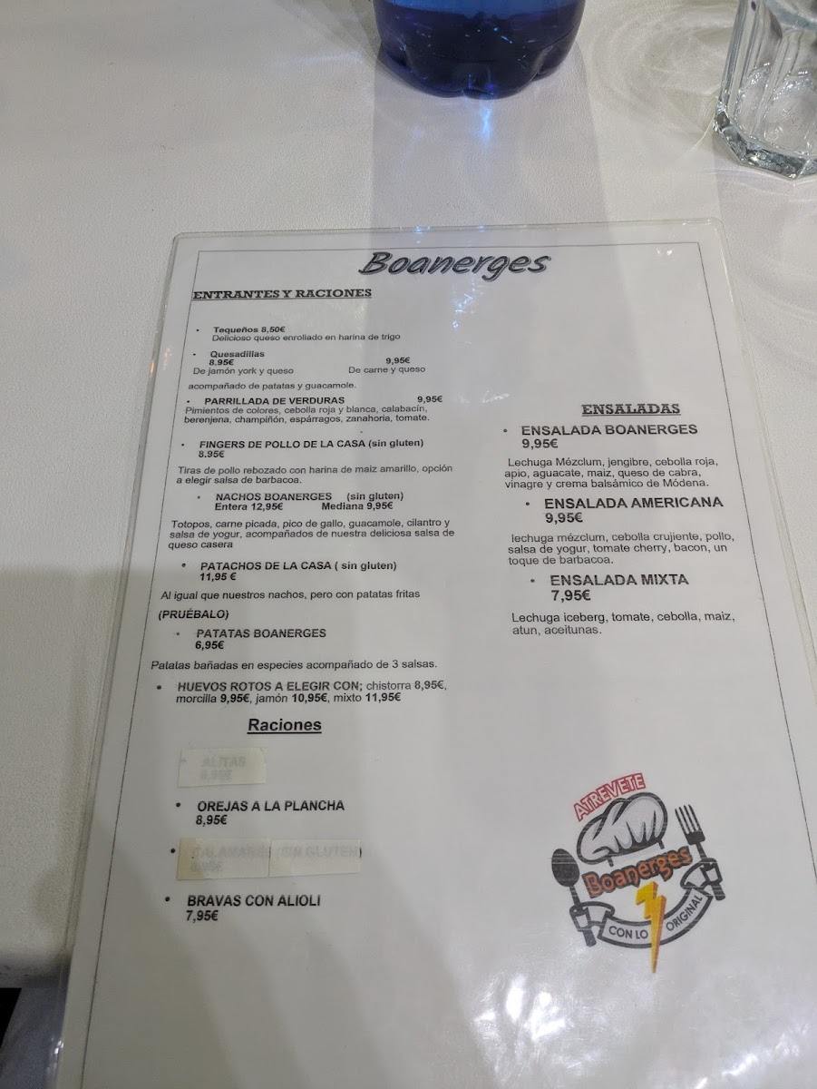 - Salads: Indulge in the fresh Ensalada americana or the distinctive Ensalada Boanerges, each priced around €9.95, showcasing ingredients like goat cheese and ginger.